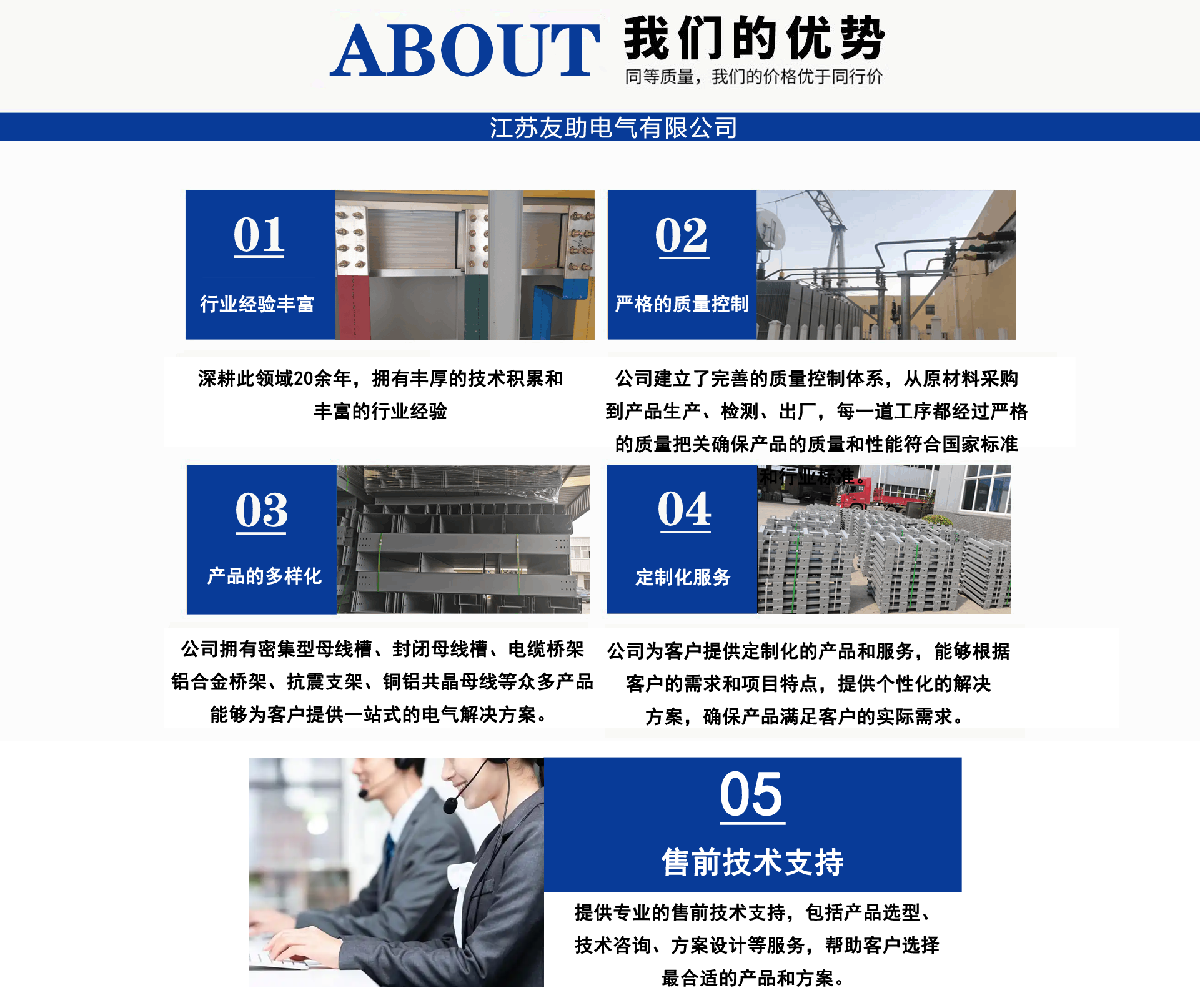 江蘇友助電氣有限公司地處中國工程電氣生產(chǎn)基地-一江蘇省揚(yáng)中市。經(jīng)營范圍:電纜橋架,母線槽(橋),管型母線,銅軟連接(伸縮節(jié)),高低壓開關(guān)柜,配電箱,抗震支架產(chǎn)品系列。 公司宗旨:客戶至上。已成功為江蘇二十屆省運(yùn)會(huì)會(huì)場(chǎng)-泰州體育館,南京寶龍商業(yè)綜合體,張家口百兆瓦風(fēng)電場(chǎng),濟(jì)源市婦幼醫(yī)院,威海市未來科技園,湖北皇恩燁新材料科技有限公司,南京中央路小學(xué),南通中天大酒店,新疆新安特鋼有限公司,河北省送變電有限公司,南京南微醫(yī)學(xué)研發(fā)基地等多項(xiàng)工程配套服務(wù),我們?cè)概c您精誠合作,互利共贏!公司技術(shù)人員深耕橋架,母線領(lǐng)域30年,為您提供橋架,母線槽疑難問題解決方案。母線槽不論每相是單排,雙排,三根排重疊,不管有多少個(gè)水平彎、垂直彎,轉(zhuǎn)接排在發(fā)貨前預(yù)裝一遍,確保尺寸無誤。到現(xiàn)場(chǎng)直接擰螺絲,效率高,橫平豎直,規(guī)規(guī)矩矩,符合標(biāo)準(zhǔn),供電局,業(yè)主,監(jiān)理,驗(yàn)收易通過。供貨周期3-7天。為了讓尊貴客戶您,設(shè)備安全通電,高枕無憂。我們提供如下售前售中售后服務(wù): 售前:免費(fèi)技術(shù)支持,咨詢。 售中:免費(fèi)現(xiàn)場(chǎng)精確測(cè)繪、設(shè)計(jì)。 售后:安裝服務(wù),免費(fèi)指導(dǎo)。 質(zhì)量是生命,客戶是源泉。承諾客戶的,一定全力做到。讓我們一起進(jìn)步!...